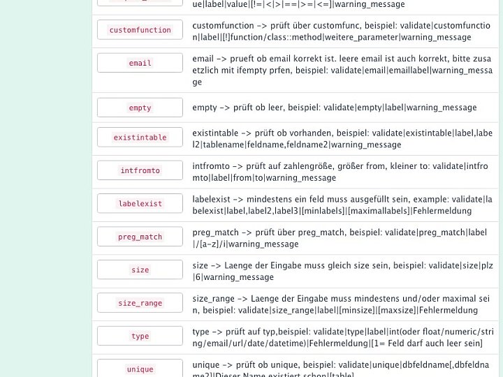 Das Verzeichnis validate enthält – wie der Name schon sagt – Klassen zur Überprüfung von Feldeingaben. Zum Beispiel: Ein Feld darf nicht leer sein, die Mailadresse ist nicht valide, die PLZ muss fünf Ziffern haben, ein eingebener Name ist schon der Datenbank vorhanden, etc.