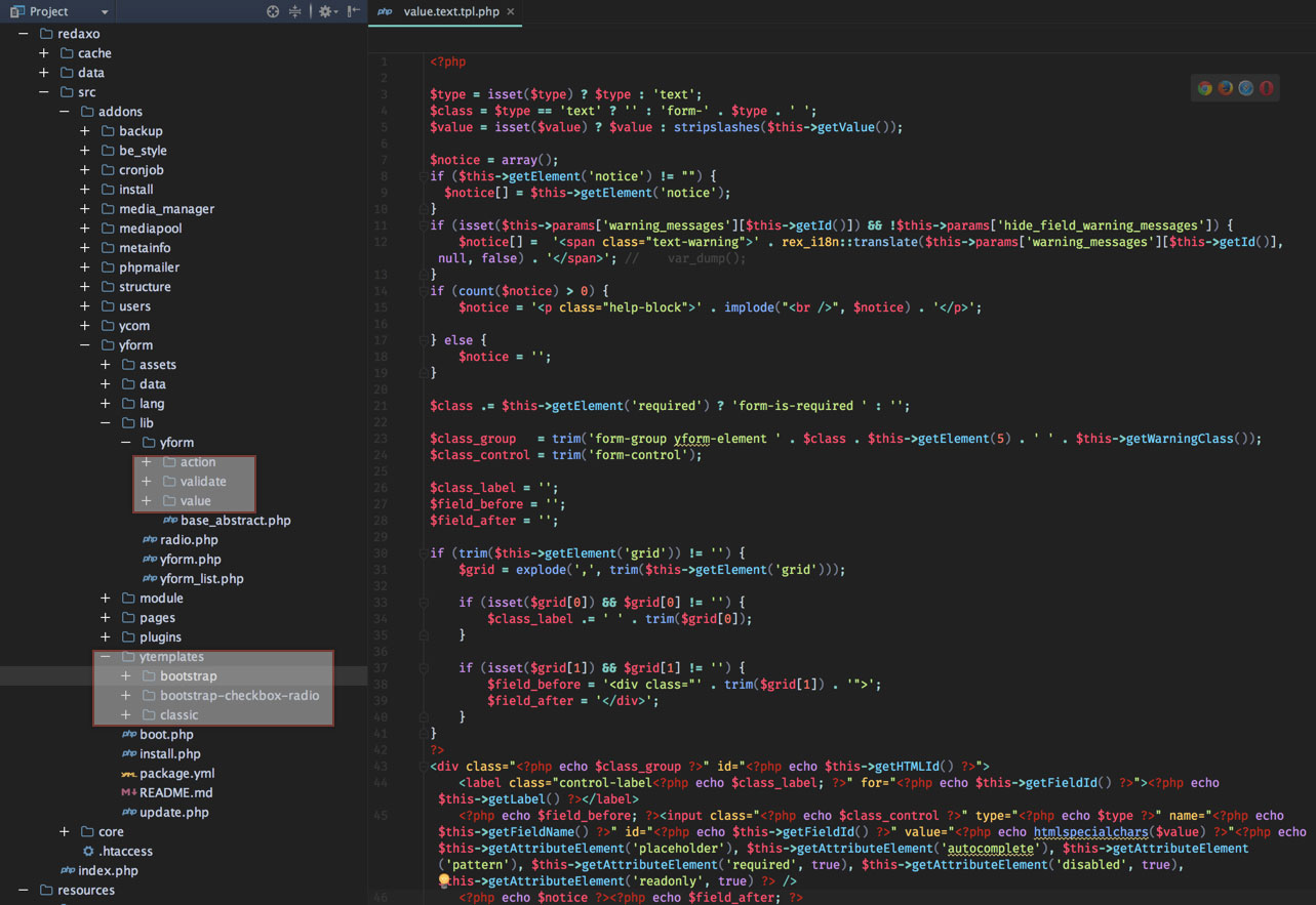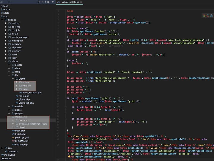 Wenn man sich die Ordnerstruktur ansieht, so erkennt man, dass man Yform flexibel selbst erweitern kann: Man legt einen eigenen Theme-Ordner an und erstellt für die gewünschten Felder eigene Template-Dateien an. Bei allen Feldern, die keine eigene Template-Datei bekommen, wird das Template des Default-Themes (classic) verwendet.