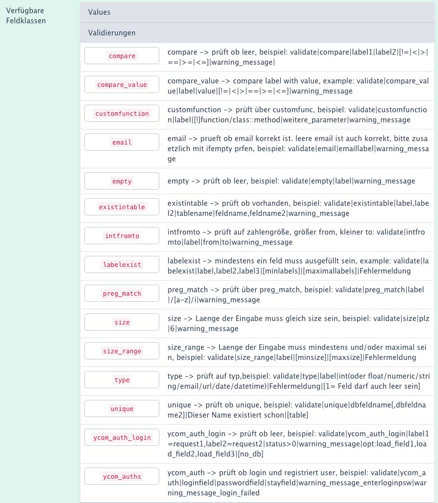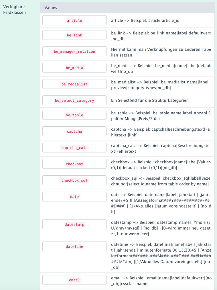 Man sieht, dass die einzelnen Optionen jeweils durch ein Pipe-Symbol (vertikaler Strich) abgetrennt sind. Die vollständigen Optionen für jedes Feld kann man direkt im YForm-Modul ersehen. Beim Textfeld findet man beispielsweise folgende Optionen: