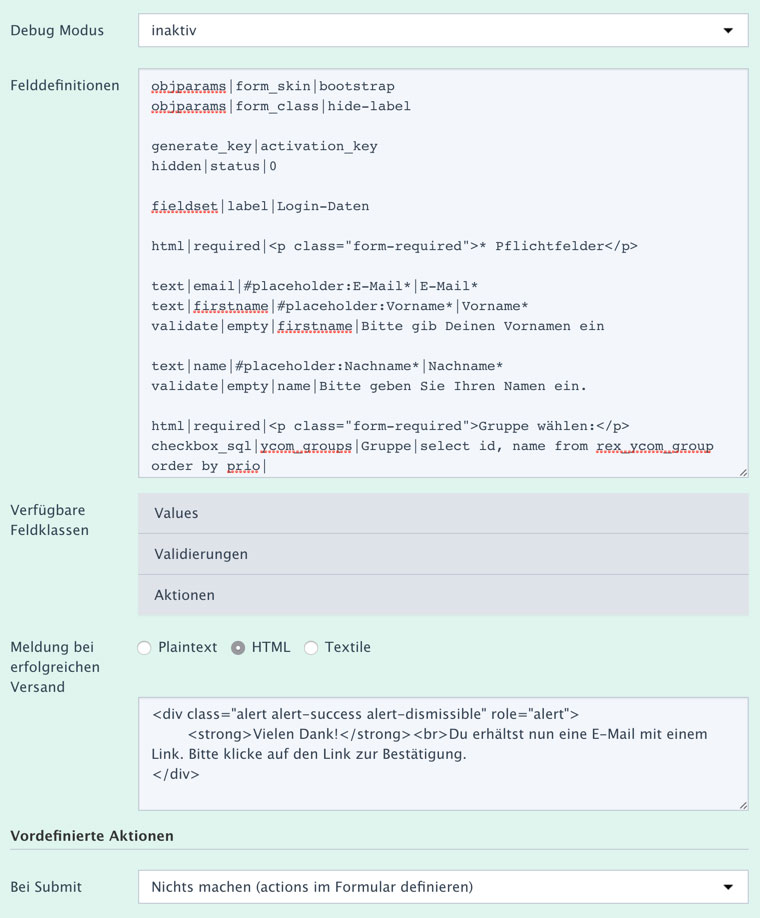 Nach der Installation von YForm kann man im AddOn mit einem Mausklick ein YForm-Modul anlegen, in das man lediglich die Values, Validierungen und Aktionen tippen muss. Die genaue Syntax findest Du im Modul.