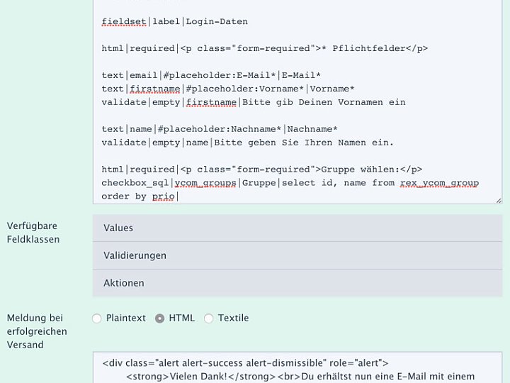 YForm bringt nicht nur alle gängigen Feldtypen mit, sondern stellt auch vielfältige Validierungen bereit, Funktionen zum Versand von E-Mails sowie Aktionen, die zum Beispiel Daten in eine Datenbank schreiben oder Weiterleitungen ausführen.