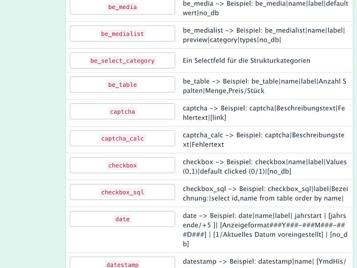 Man sieht, dass die einzelnen Optionen jeweils durch ein Pipe-Symbol (vertikaler Strich) abgetrennt sind. Die vollständigen Optionen für jedes Feld kann man direkt im YForm-Modul ersehen. Beim Textfeld findet man beispielsweise folgende Optionen: